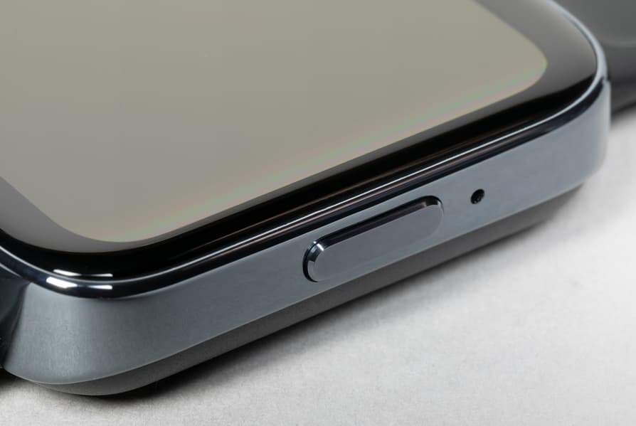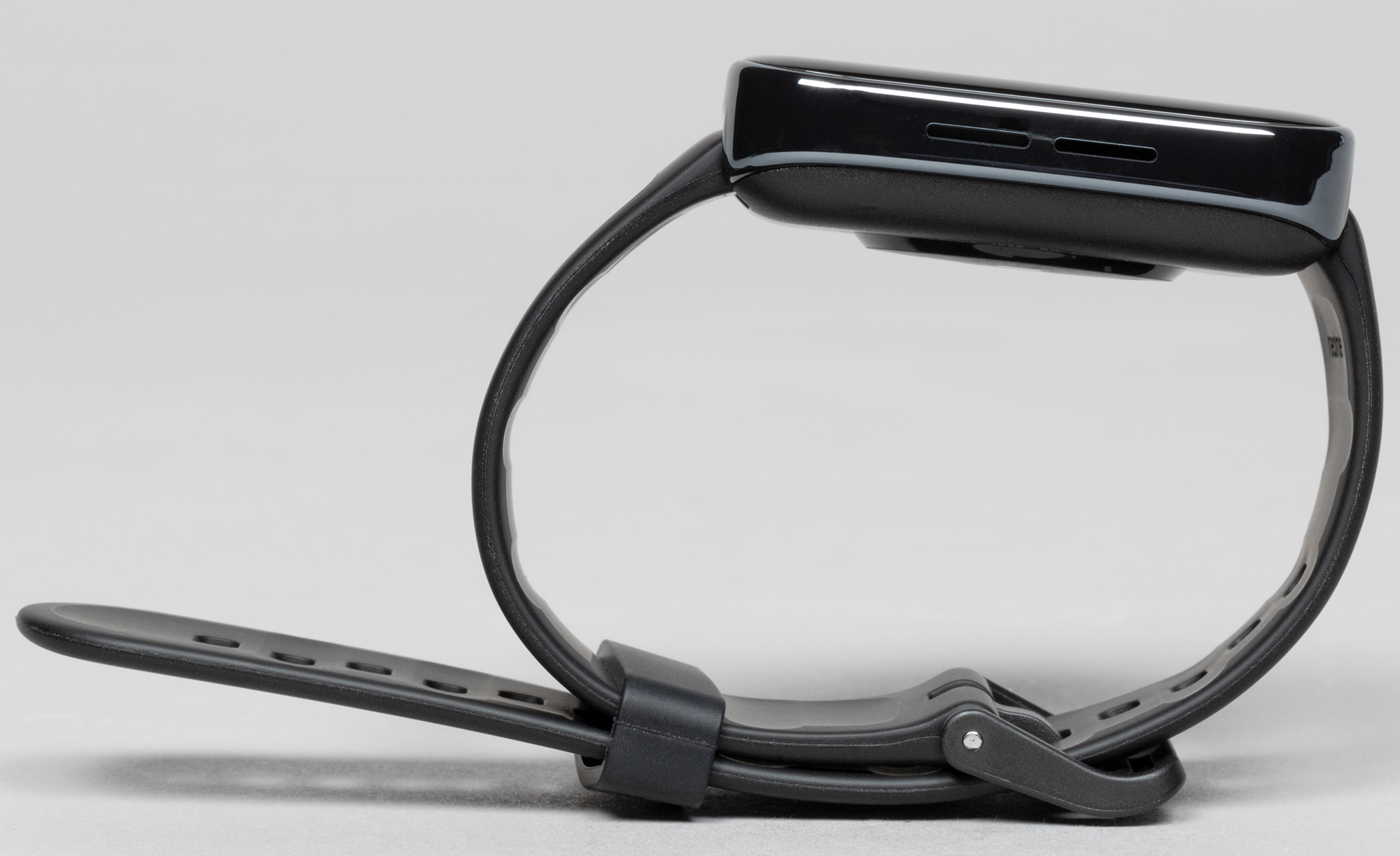 Но главное отличие дизайна — появление отверстия для микрофона (мы видим его около продолговатой кнопки «Домой») и прорезей для динамика — на противоположной грани. Кстати, на фото ниже видно довольно объемную часть из обычного матового черного пластика, но при ношении она совершенно не бросается в глаза ни пользователю, ни окружающим, поскольку прилегает к руке.