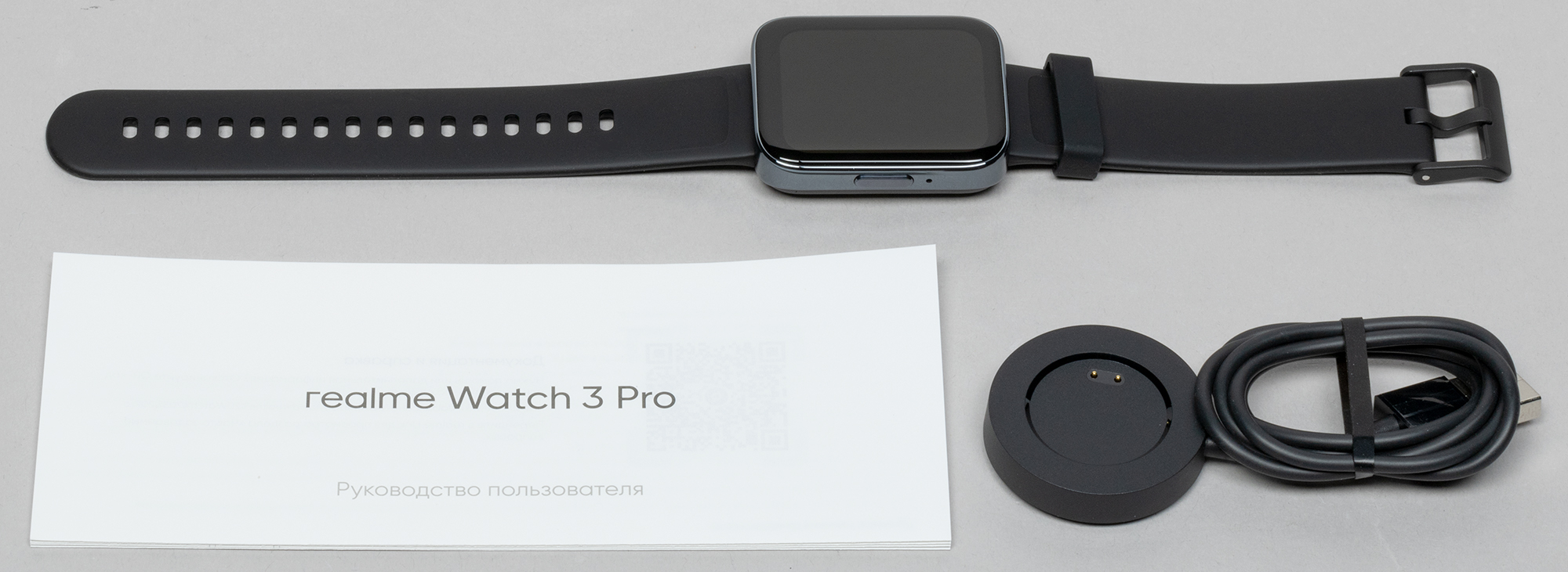 Комплектация крайне скромна и аналогична предшественникам: помимо самих часов — только краткое руководство пользователя (на русском языке) и зарядное устройство в виде платформы, на которую сверху кладутся часы. USB-кабель у зарядки неотсоединяемый.