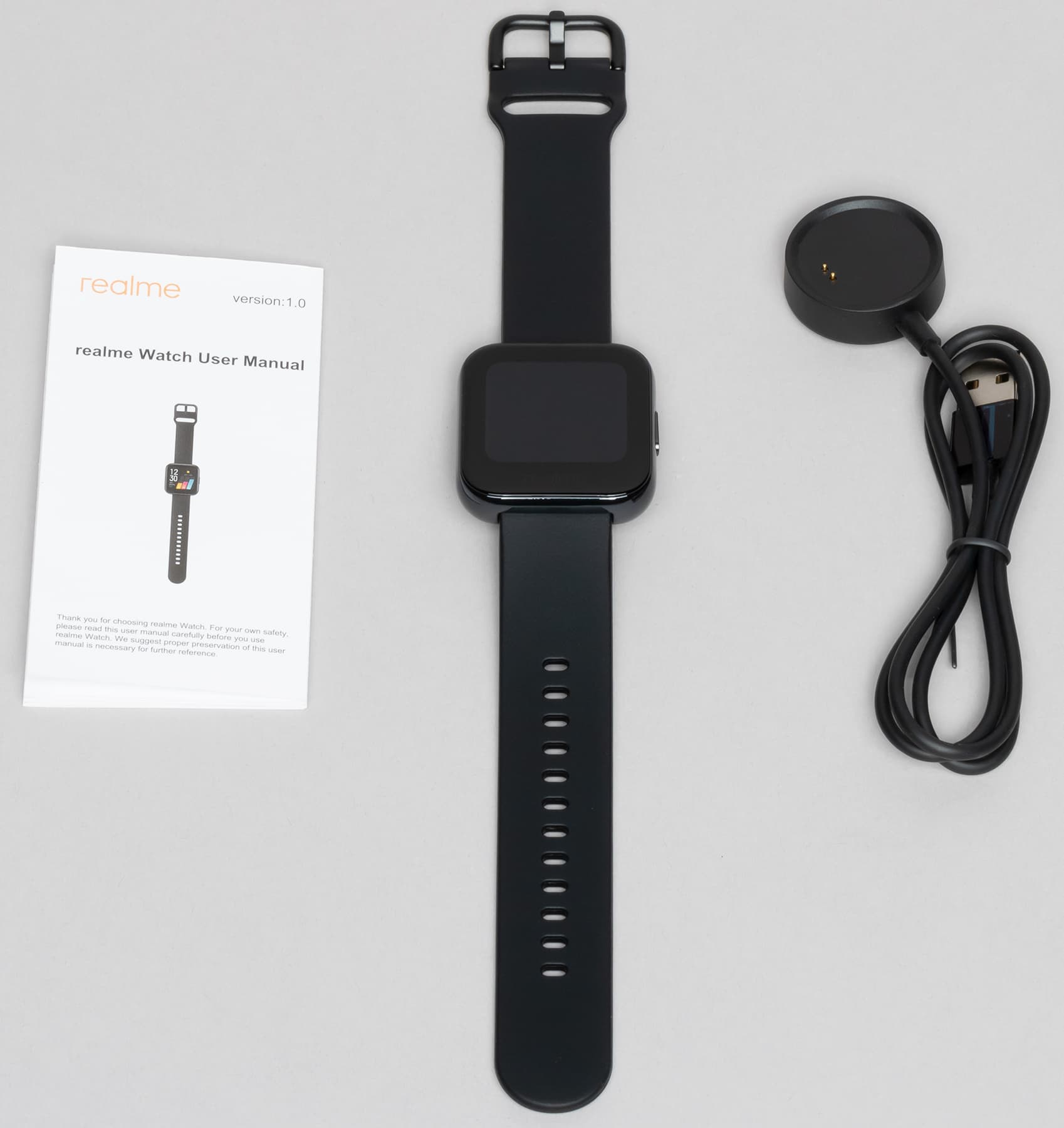 Комплектация минималистична: помимо самих часов — только руководство пользователя и зарядное устройство в виде платформы, на которую кладутся сверху часы. USB-кабель у зарядки неотсоединяемый.