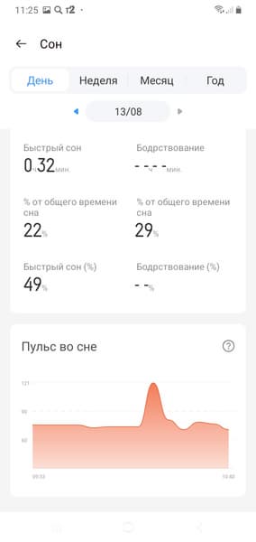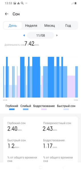 Кстати, в отношении сна мы заметили странную особенность часов. Если вы, проспав ночь, встав утром и позавтракав, решите еще вздремнуть, то часы зафиксируют только этот второй сон, даже если он будет около часа. С одной стороны, это здорово, что часы в принципе корректно (даже днем) могут определять краткосрочный сон. С другой — данные за предыдущий сон, если он был не в прошлые сутки, видимо, просто перезаписываются, и найти их невозможно. На скриншотах ниже — тот самый утренний сон. Если нажать на стрелочку влево, которая находится рядом с датой 13/08 — попадем на предыдущую дату, где уже сон за прошлую ночь, а не за эту.