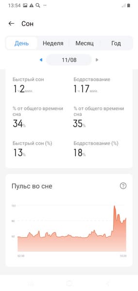Так, например, в случае со сном отображается общая диаграмма с детализацией (продолжительность различных фаз сна в минутах и процентах), а также пульс.
