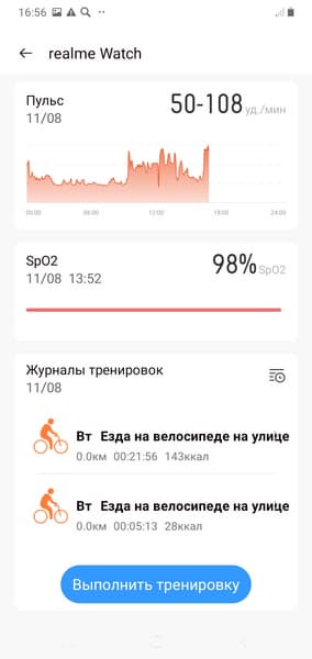 Часы поддерживают 14 видов тренировок, в том числе такие экзотические, как крикет, настольный теннис, эллиптический тренажер и пр. Увы, среди них по понятной причине нет плавания: стандарт защиты IP68 не позволяет использовать Realme Watch в бассейне.