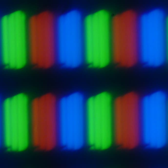 На уровне яркости ниже максимального есть модуляция подсветки, но ее частота очень высокая — порядка 10 кГц, поэтому мерцания не видно. Микрофотографии демонстрирую типичную для IPS структуру субпикселей.