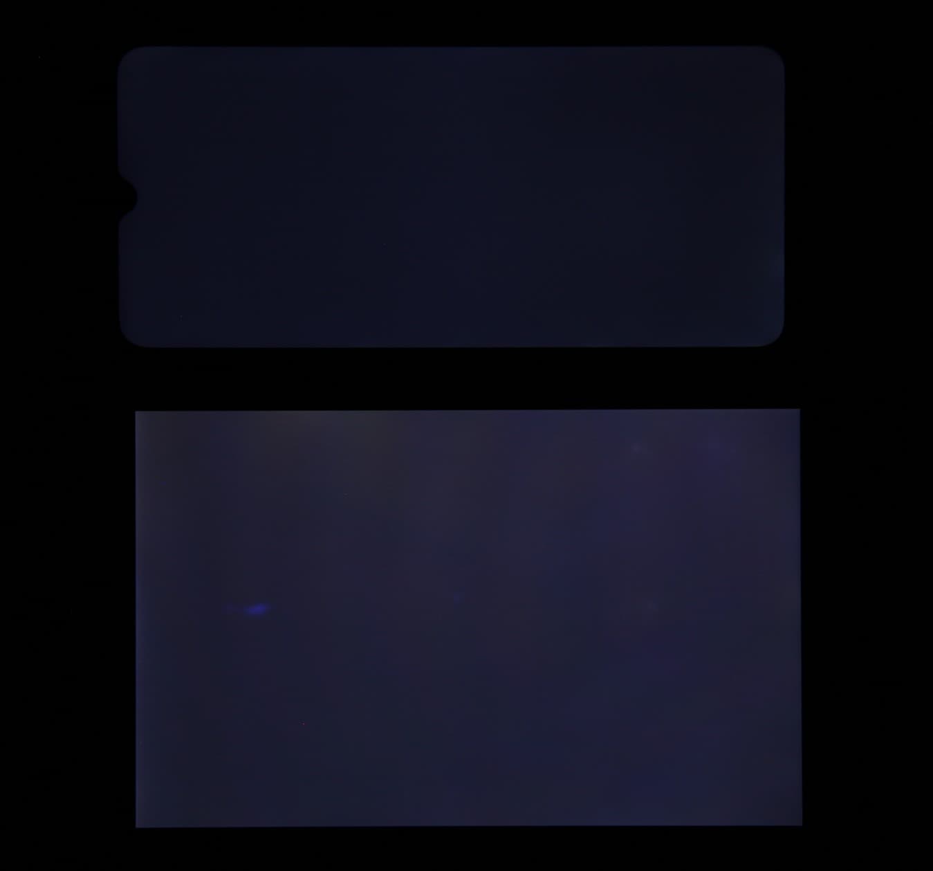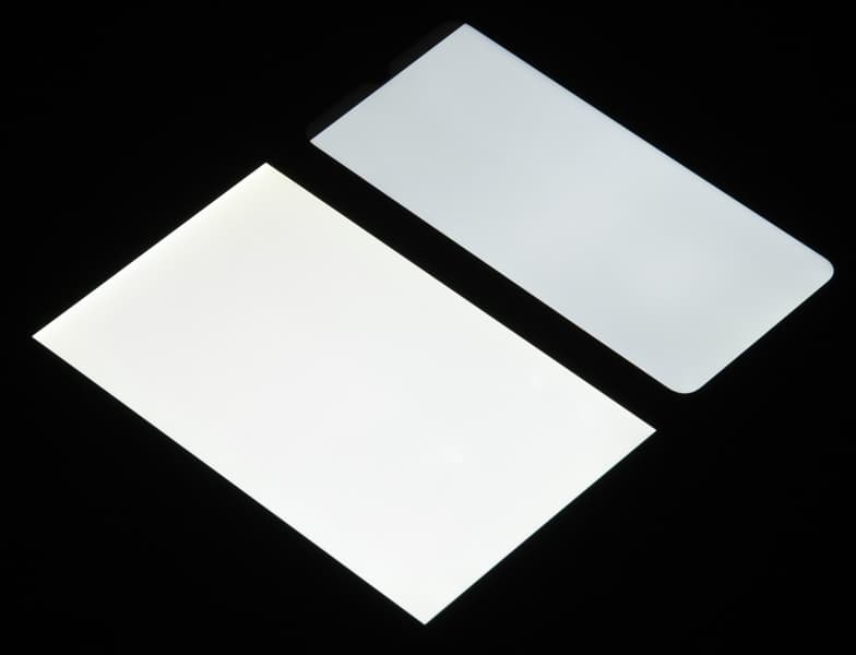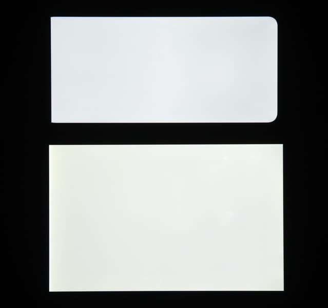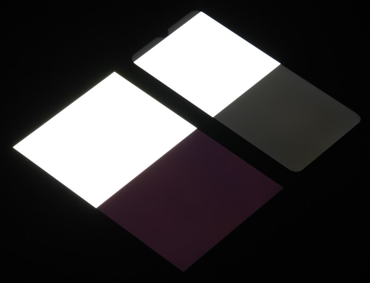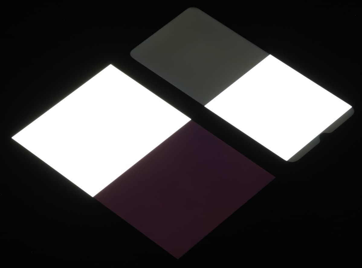 Яркость под углом у экранов уменьшилась (как минимум в 5 раз, исходя из разницы в выдержке), но в случае смартфона яркость снизилась сильнее. Черное поле при отклонении по диагонали сильно высветляется, но остается условно нейтрально-серым. Фотографии ниже это демонстрируют (яркость белых участков в перпендикулярном плоскости экранов направлении одинаковая!):