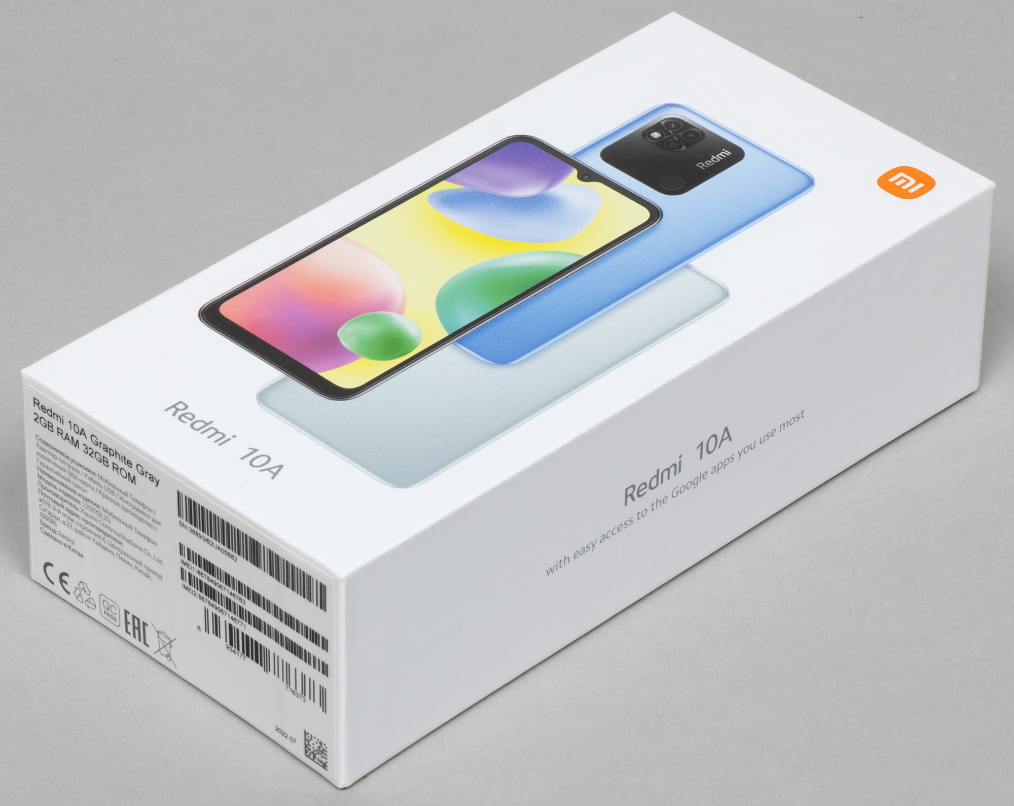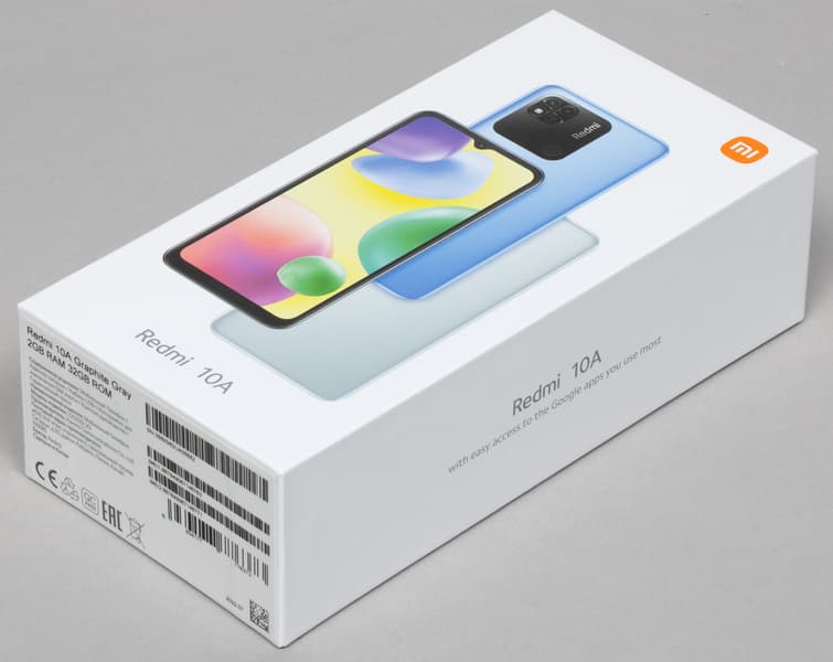 Redmi 10A поставляется в твердой картонной упаковке, оформленной в максимально спокойном стиле.