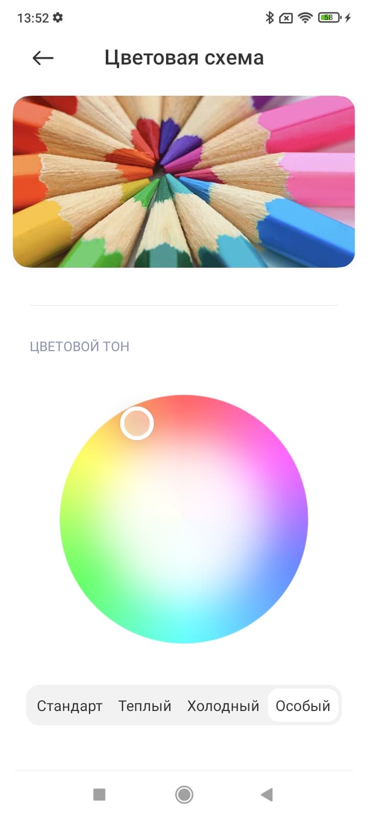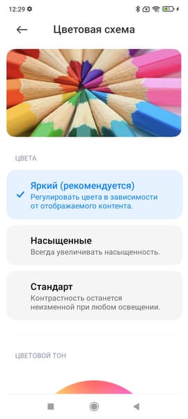 По умолчанию в случае профилей Яркий и Насыщенные цветовая температура высоковата. Однако в этом устройстве при выборе профиля Яркий есть возможность скорректировать цветовой баланс с помощью регулировки оттенка точкой на цветовом круге или выбирая предустановленные варианты.