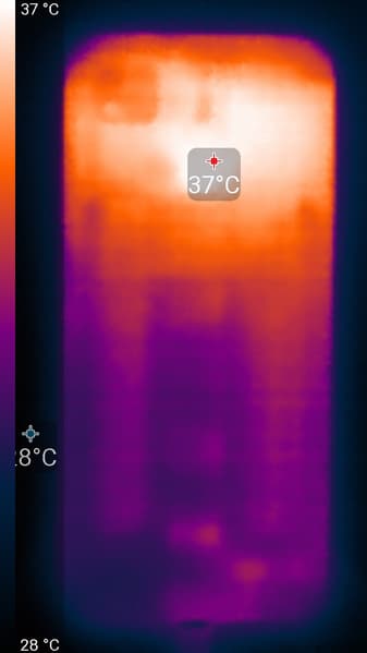 Нагрев выше в верхней части аппарата, что, видимо, соответствует расположению микросхемы SoC. По данным теплокамеры, максимальный нагрев составил 38 градусов (при температуре окружающего воздуха в 24 градуса), это не очень много.