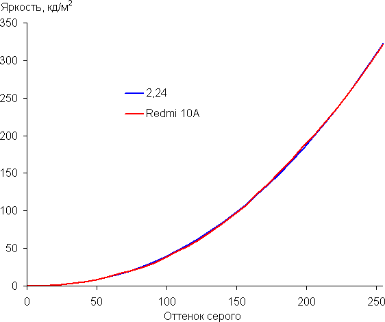 Контрастность (примерно в центре экрана) высокая — порядка 1250:1. Время отклика при переходе черный-белый-черный равно 20 мс (10 мс вкл. + 10 мс выкл.). Переход между полутонами серого 25% и 75% (по численному значению цвета) и обратно в сумме занимает 34 мс. Построенная по 32 точкам с равным интервалом по численному значению оттенка серого гамма-кривая не выявила завала ни в светах, ни в тенях. Показатель аппроксимирующей степенной функции равен 2,24, что немного выше стандартного значения 2,2. При этом реальная гамма-кривая мало отклоняется от степенной зависимости: