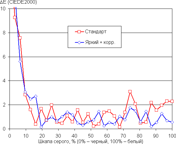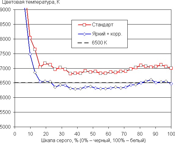 Впрочем, при выборе профиля Стандарт цветовая температура снижается. Ниже представлен результат после ручной коррекции (точка на круге — как на снимке выше) в случае профиля Яркий и просто при выборе профиля Стандарт. (Самые темные области шкалы серого можно не учитывать, так как там баланс цветов не имеет большого значения, да и погрешность измерений цветовых характеристик на низкой яркости большая.)