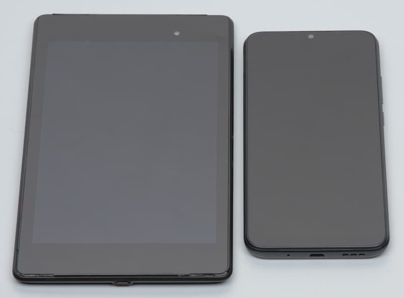 Лицевая поверхность экрана выполнена в виде стеклянной пластины с зеркально-гладкой поверхностью, устойчивой к появлению царапин. Судя по отражению объектов, антибликовые свойства экрана лучше, чем у экрана Google Nexus 7 (2013) (далее просто Nexus 7). Для наглядности приведем фотографию, на которой в выключенных экранах отражается белая поверхность (слева — Nexus 7, справа — Redmi 10A, далее их можно различать по размеру):