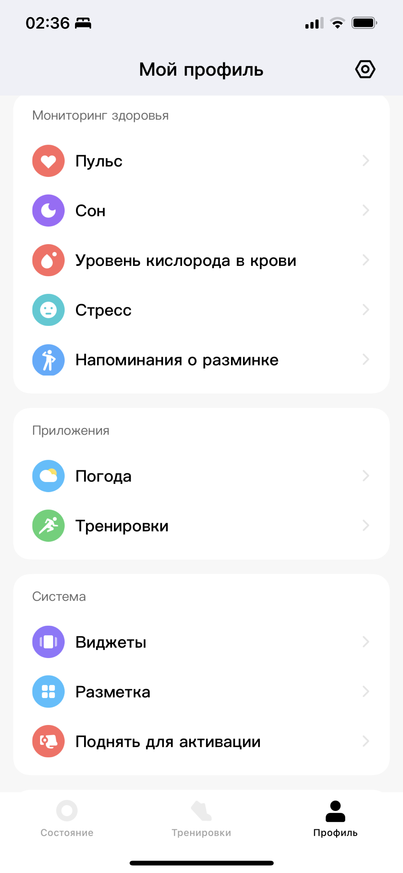 Но вернемся к большим разделам. Вся информация с часов собрана в меню «Мое состояние». Здесь указывается количество шагов/калорий за день, последняя тренировка, последний сон, пульс за сутки, количество кислорода в крови, стресс и активность за тот же период.