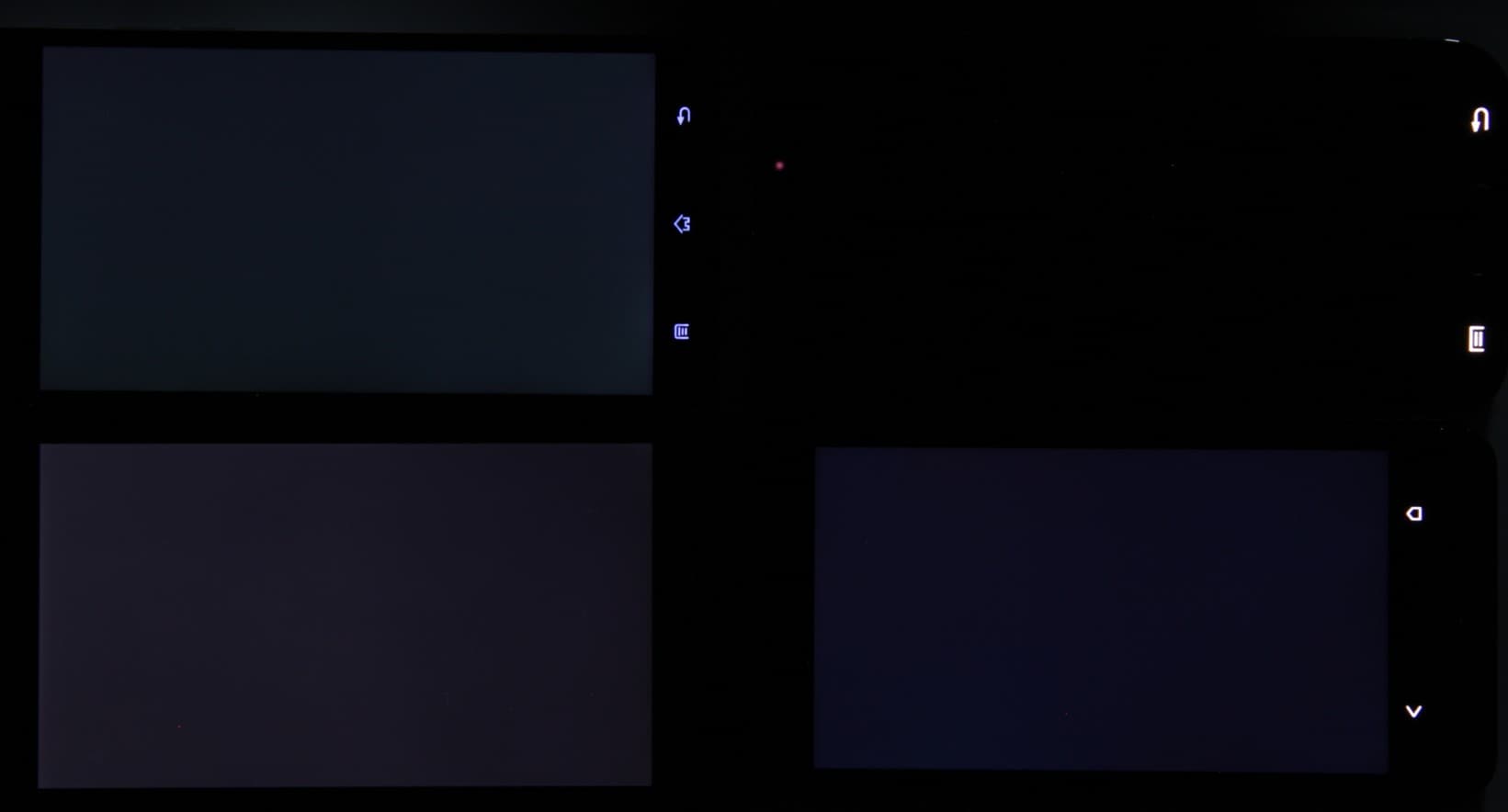 Так как яркость белого поля уже установлена на 100 кд/м² (и у участников с ЖК-экранами динамической постройки яркости подсветки мы не выявили), то уровень засветки черного поля определяет фактическую контрастность изображения в условиях низкой внешней освещенности. Черный цвет на экране Samsung Galaxy S4 абсолютно черный (но светящиеся кнопки и индикатор выдают присутствие телефона), что сразу определило победителя в этом тесте. Для оставшихся мы по фотографии рассчитали среднюю яркость черного поля (без учета «горячих» пикселей на матрице фотоаппарата — яркие точки, расположенные там, где их быть не должно). Выше она оказалась у Sony Xperia Z — последнее место. Следующая фотография сделана в тех же условиях, только экраны сняты под углом при отклонении примерно по диагонали (сверху вниз и слева направо — Samsung Galaxy S4, HTC One, Oppo Find 5 и Sony Xperia Z):
