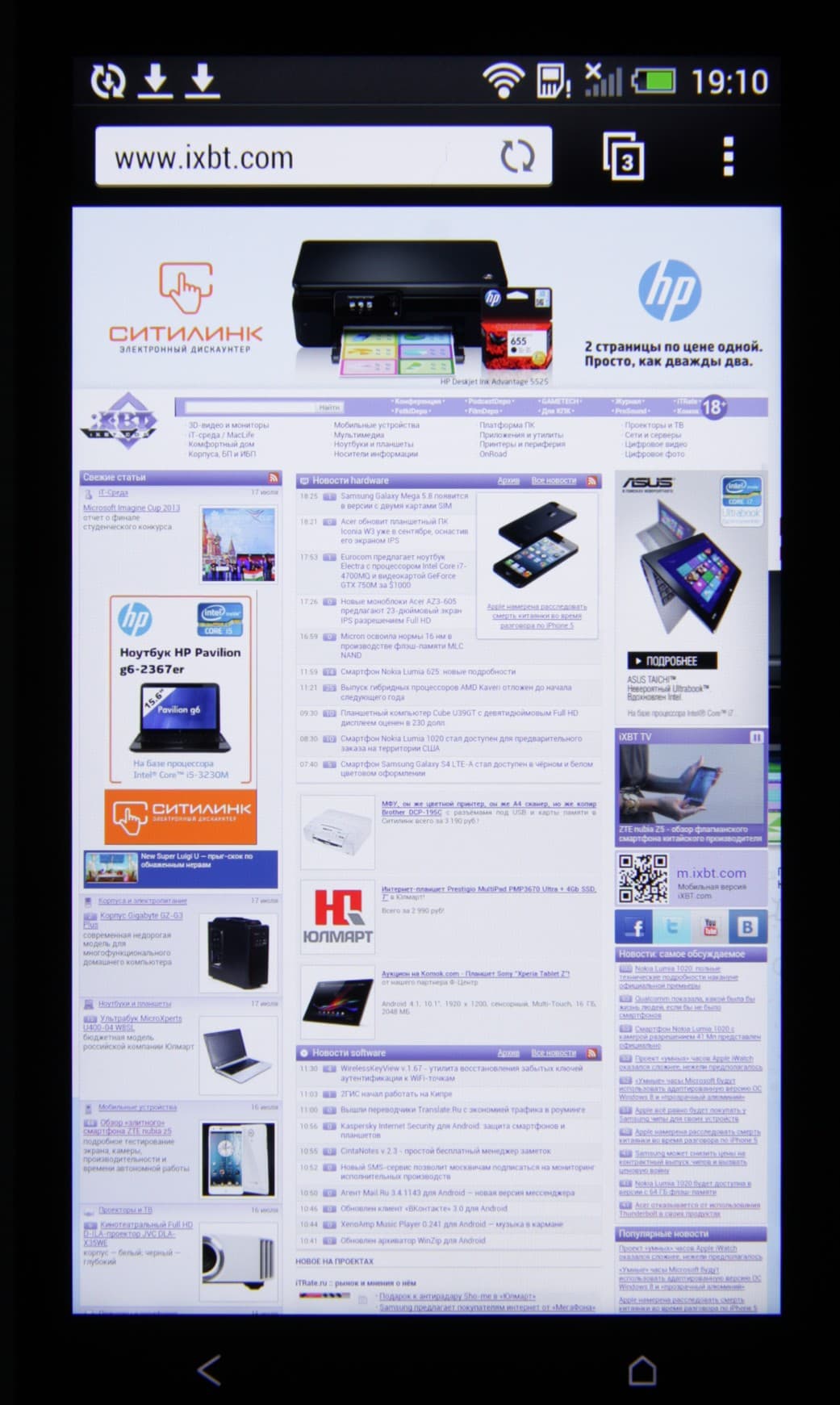 Формально разрешение у экранов всех четырех телефонов одинаковое и размер тоже не очень отличается, поэтому в следующем тесте мы попробовали оценить читаемость мелкого текста в примерно одинаковых условиях, для чего вывели на экран заглавную страницу нашего сайта с масштабированием по ширине экрана: