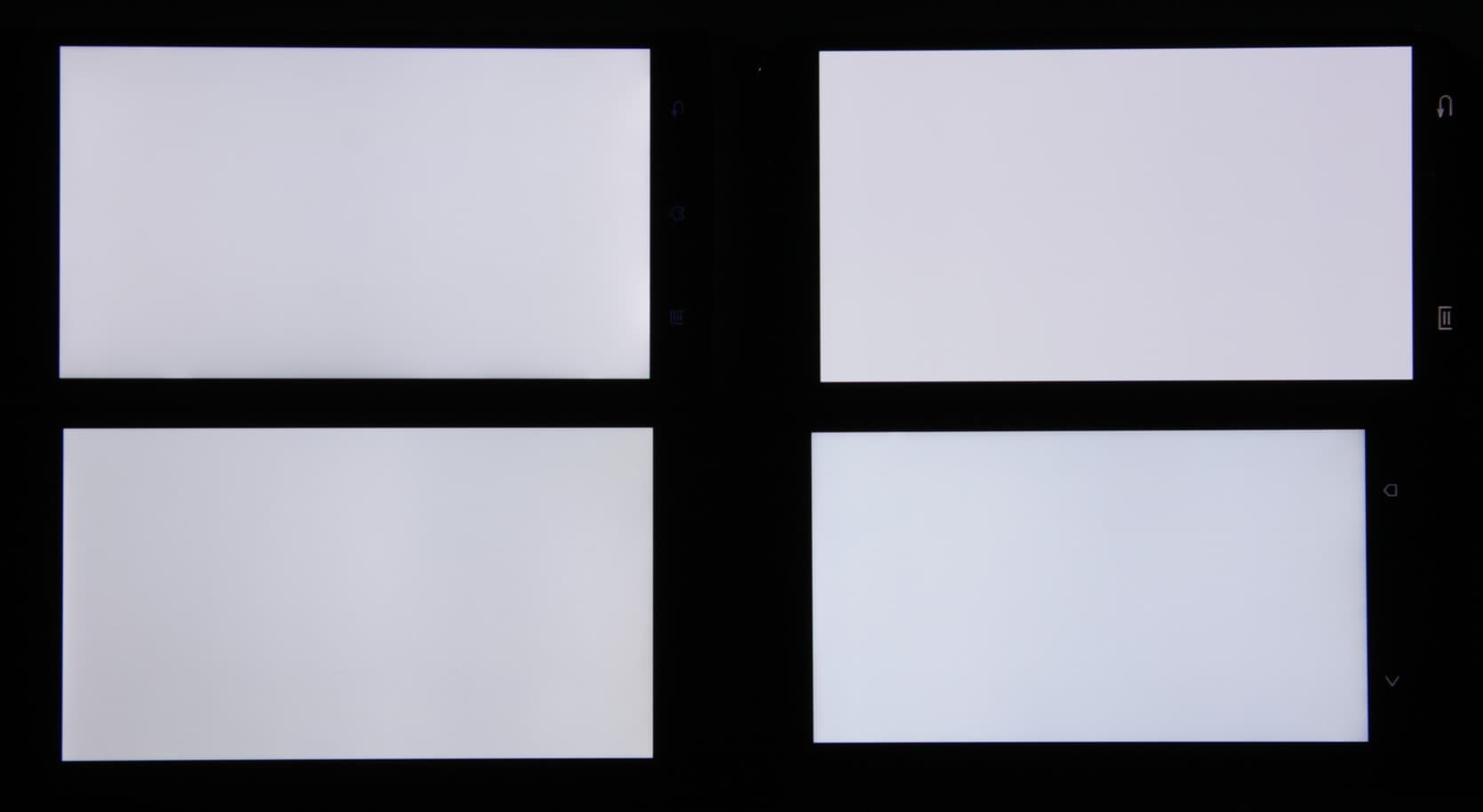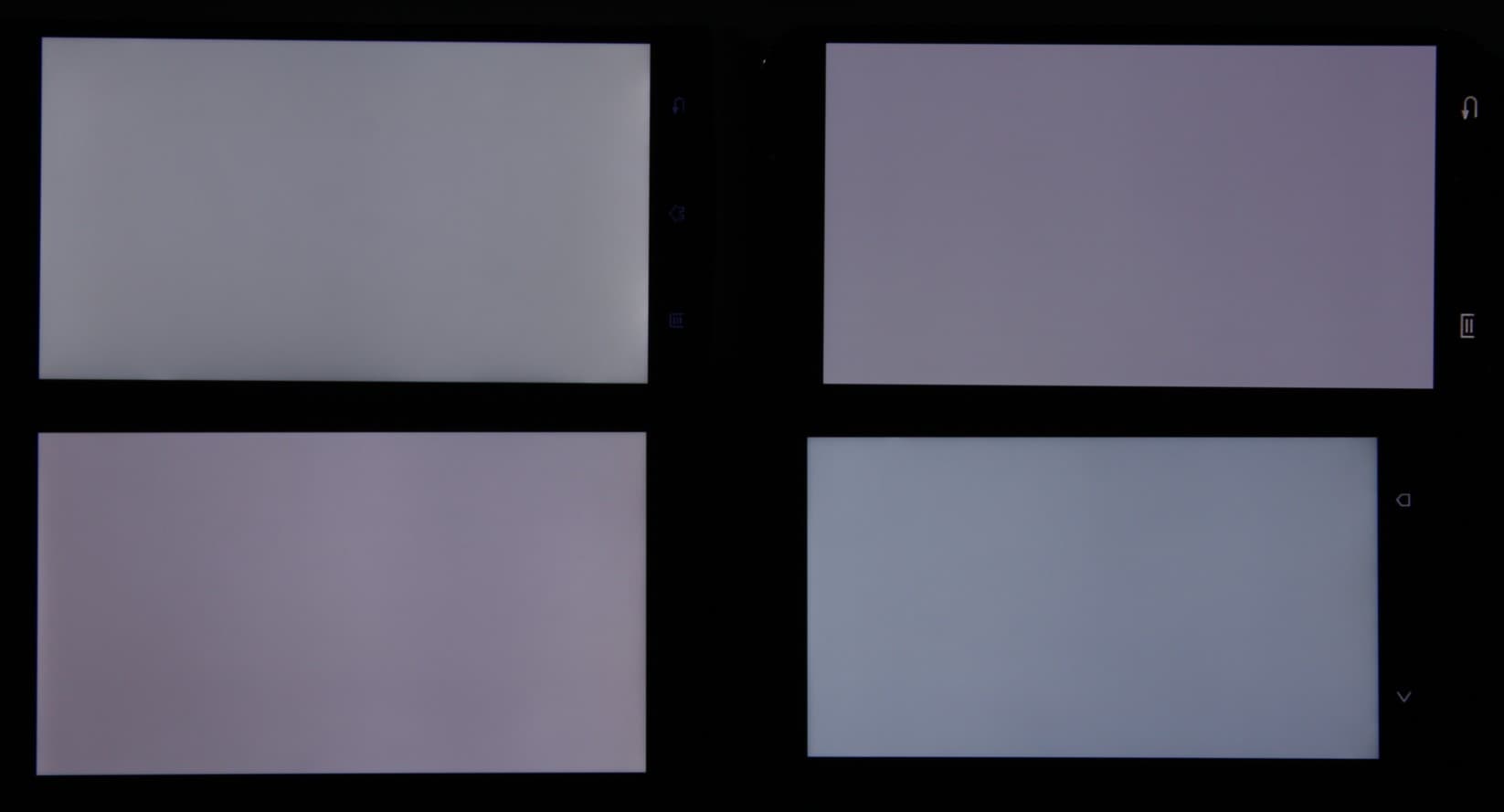 Какую-то оценку можно сделать и визуально, просто рассматривая эти фотографии, но мы опять прибегли к помощи графического редактора и определили средние цветовые координаты экранов в пространстве Lab. Чем меньше сумма отклонений координат a и b от 0, тем ближе оттенок к белому и серому цвету. Белый цвет в целом неплох у всех экранов, но чище он оказался у Sony Xperia Z, а «грязнее» — у Samsung Galaxy S4. Этот же экран занял последнее место и в тесте с серым экраном, но тут на первое место вышел Oppo Find 5. Если проанализировать приведенные в первой части графики с цветовой температурой и отклонением от спектра абсолютно черного тела (дельта Е), то, как ни странно, результаты аппаратного и «фотографического» теста между собой согласуются, так как именно на белом поле у Sony Xperia Z и цветовая температура близка к 6500 К, и дельта Е мало, а на сером все становится по-другому — дельта Е у Sony Xperia Z резко возрастает, тогда как у Oppo Find 5 оба параметра остаются более-менее в норме. Также оценим, как меняется белое поле при взгляде под углом к экрану (верхний ряд слева направо — HTC One и Sony Xperia Z, нижний ряд слева направо — Samsung Galaxy S4 и Oppo Find 5):
