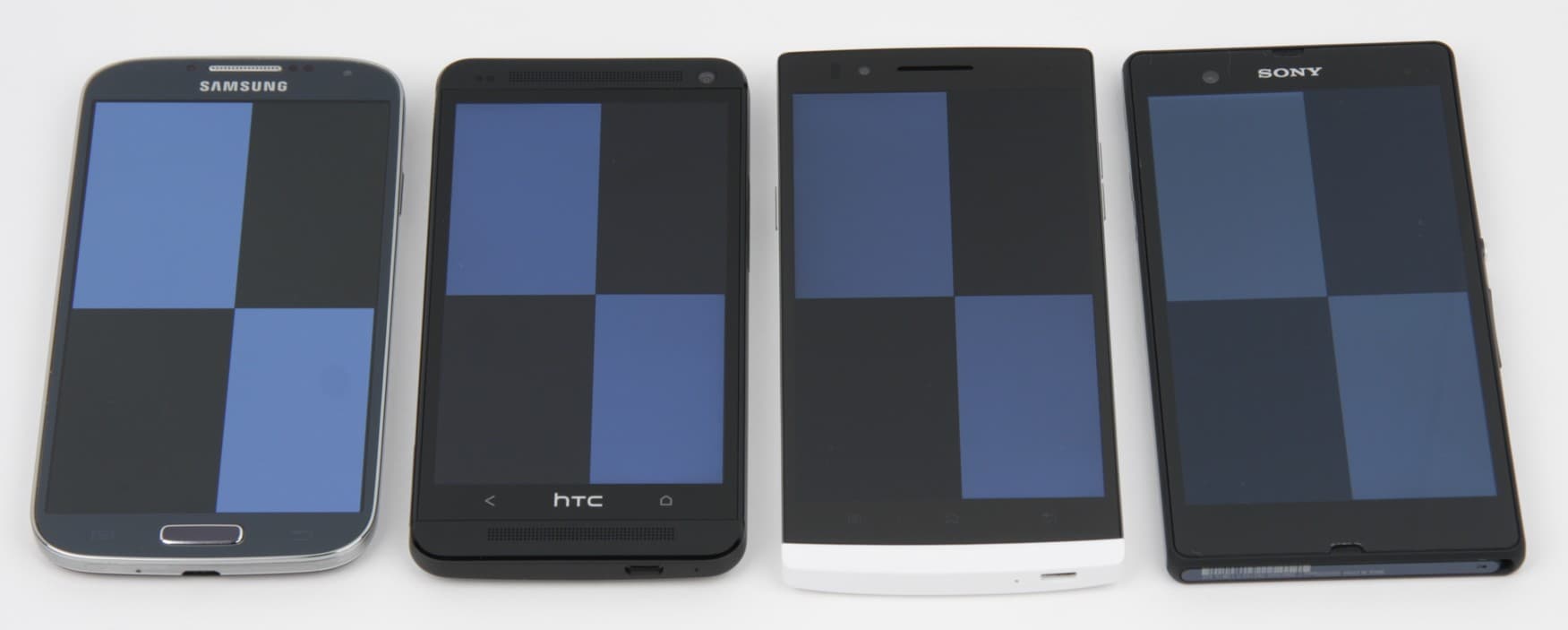 На фотографии ниже на экраны всех четырех устройств (верхний ряд слева направо — Oppo Find 5 и Samsung Galaxy S4, нижний ряд слева направо — Sony Xperia Z и HTC One) выведено черное поле: