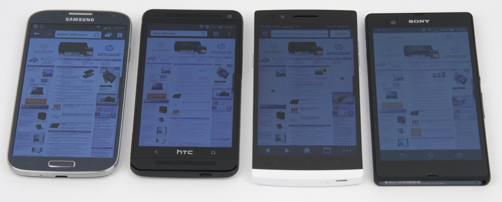 В данном материале мы собрали четыре топовых устройства разных производителей, полные обзоры по которым уже были опубликованы на нашем сайте. Ими стали: HTC One, Oppo Find 5, Samsung Galaxy S4 и Sony Xperia Z. С материалами их тестирования вы можете ознакомиться по ссылкам, а в этой статье мы сосредоточимся на нескольких сравнительных тестах: экранов, камер и беспроводных коммуникаций. Но для начала напомним технические характеристики участников.
