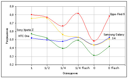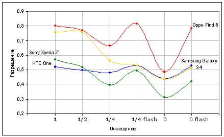 Использование вспышки полностью меняет распределение соперников по местам. Теперь на первом месте оказывается Oppo Find 5, за ним идет Sony Xperia Z, и третье место делят Samsung Galaxy S4 и HTC One.