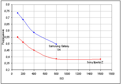 График лишь подтверждает то, что видно невооруженным глазом по мирам: Samsung Galaxy S4 справляется с шумами гораздо успешнее. Sony Xperia Z проигрывает Samsung Galaxy S4 с самых первых зачений и при этом еще продолжает соревноваться в той области, куда Samsung Galaxy S4 даже не рискнул зайти.