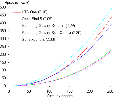 Во всех пяти случаях (четыре смартфона и два профиля для Samsung Galaxy S4) завала нет ни в светах, ни в тенях, при этом реальная гамма-кривая практически не отклоняется от степенной зависимости. Показатель аппроксимирующей степенной функции ближе всего к стандартному значению 2,2 в случае HTC One. Для Sony Xperia Z показатель ниже, то есть изображения будут в целом чуть светлее. Для Samsung Galaxy S4 показатель выше стандартного значения, но в этом аппарате есть замысловатая динамическая подстройка яркости, поэтому полученные нами зависимости яркости от оттенка (гамма-кривые) могут не соответствовать гамма-кривым статичного изображения, так как измерения проводились при последовательном выводе оттенков серого на весь экран. Заметим, что эти кривые также наглядно демонстрируют, насколько различается максимальная яркость белого поля у протестированных аппаратов.