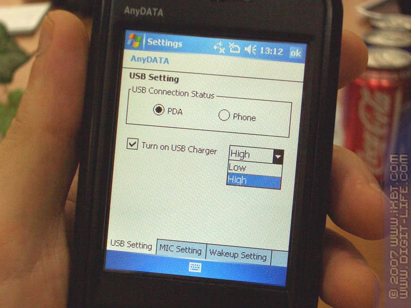 Для подключения через USB-кабель предусмотрены режимы «PDA» (работа с ActiveSync) и «Phone» (это, видимо, режим исключительно для работы как CDMA-модема). Для второго режима, очевидно, потребуются драйвера, которые уже существуют — это те же самые драйвера, что идут для таких моделей как Anydata ADU-100A/300A/310A. Режима для работы в качестве «mass storage» нет, и, видимо, не будет; если кому-то это покажется нужным, можно будет использовать сторонний софт. Интересен режим управления зарядкой при подключении через кабель — помимо «Выключено», имеется два варианта «High» и «Low».