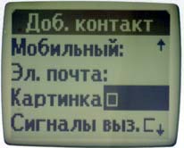 Записная книга в памяти телефона позволяет сохранить до 300 номеров; для одного имени вводятся следующие данные: Имя, Фамилия, три телефонных номера, адрес электронной почты — для 10 номеров можно также установить картинку, которая будет отображаться при входящем звонке данного абонента. Картинки выбираются из тех, что предназначены для отправки с SMS-сообщениями, их достаточно много. Необходимо, однако, помнить, что номера должны быть занесены целиком, то есть с кодом. Максимальное число сохраняемых книгой адресов электронной почты равно 10. 42 абонентам из телефонной книги можно назначить голосовые метки, причем набор различных типов номеров предусмотрен изначально. Так, для вызова домашнего, рабочего и мобильного номеров записываются отдельные метки, которые произносятся после основной — имени абонента.