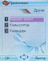 Приложения. Здесь собраны программы просмотра медиафайлов, хранящихся в телефоне, установки будильника, планирования задач, калькулятор, календарь и апплет мирового времени. В календарь ничего занести не удастся, он служит лишь для справки.