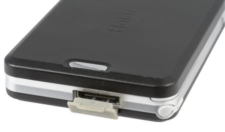 На правом торце находится разъём для подключения зарядного устройства и проводной стерео гарнитуры. Заглушка этого разъёма весьма не удобная для людей с короткими ногтями.
