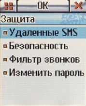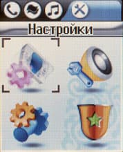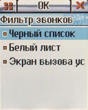 Четвертый экран отвечает за разнообразные настройки: настройки телефона, звуковых профилей, вызова (переадресация и т. п.) и защита. В последнем пункте интересен Фильтр звонков. Можно задать два списка: черный и белый. При активации первого — номера, содержащиеся в нём, не смогут к вам дозвониться, при активации второго — только номера из списка смогут расчитывать на ваше внимание.