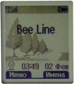 В режиме ожидания на экране отображается название оператора связи, время, дата, а также выбранный звуковой профиль. Внизу высвечиваются подписи к софт-клавишам, вверху — строка иконок, среди которых уровень сигнала сети, уровень заряда батареи (3 деления), изображение установленного будильника.