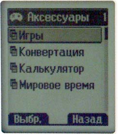 Меню Аксессуары. В пункте Мировое время можно пролистать список основных городов планеты и посмотреть часовые пояса. Тут же находится калькулятор и конвертор. Здесь вы сможете, например, преобразовать дюймы в сантиметры. Последний, в отличие от предыдущих моделей LG, называется именно конвертором, а не конвертатором. Как уже говорилось, качество русификации этой модели значительно выше, чем предыдущих. Из пяти игр, установленных в телефоне, четыре знакомы нам по другим аппаратам — Блэк Джек, Сумасш. Гонки, Корсар, Камен. Топор. Новая игра называется Команчи и до боли напоминает игрушку, в которую автор играл еще на 286-х машинах. В целом убить время можно, хотя и без особой пользы.
