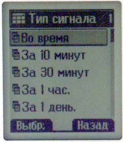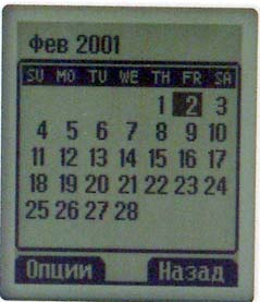 Меню Установки. Первый пункт — Будильник, совсем как в меню телефонов Nokia. Будильник устанавливается на однократное, ежедневное, еженедельное или ежемесячное срабатывание. При выключении питания телефон автоматически включается, и раздается сигнал будильника. Настроить отдельную мелодию для будильника нельзя.