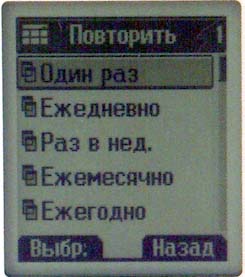 Меню Органайзер. Календарь вмещает 20 событий, которые просматриваются сразу за месяц. Чтобы освободить место для новых записей, вам придется удалить старые выборочно или все вместе. Для каждой заметки можно установить время срабатывания (однократно, ежедневно, еженедельно, ежемесячно и ежегодно). Других возможностей органайзер не предлагает.