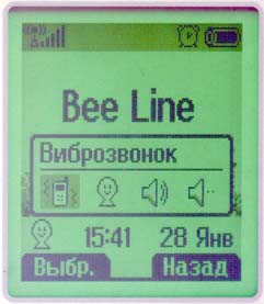 Меню аудиопроф. Данный пункт позволяет настроить профили пользователя. Аппарат поддерживает бесшумный профиль (только виброзвонок), а также профили Частный, Громкий, Без звука, для которых предусмотрена возможность установки сигнала входящего звонка, поступившего сообщения, тона клавиш и др. Режимы работы звонка можно комбинировать: только звонок, звонок и виброзвонок одновременно, звонок после виброзвонка, бесшумный режим. Приятно, что сменить профили можно просто нажав в режиме ожидания на левую стрелку — в результате появится небольшое меню, и профиль будет изменен. В режиме ожидания на экране отображается иконка текущего профиля.