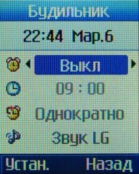 Будильник в данной модели располагается там, где ему и положено — в меню Органайзер, а не в Настройках, как это чаще всего бывает. Можно программировать один сигнал, однократный или повторяющийся ежедневно, еженедельно или ежемесячно.