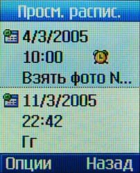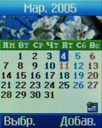 Меню Органайзер открывает доступ к календарю-органайзеру, адресной книге, будильнику, списку задач и заметкам. Календарь имеет только ежемесячный способ отображения. Возможности органайзера очень просты, он позволяет только добавлять напоминания без определения их типа, впрочем, напоминания могут повторяться с периодичностью от одного дня до года. Всего их может быть только 20, что явно мало.