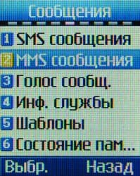 Пункт Сообщения позволяет работать с SMS и MMS. Аппарат оборудован 115 ячейками памяти для SMS и 1500 KB памяти — для мультимедийных сообщений, в обоих случаях этот объем достаточный. Поддерживаются многостраничные сообщения MMS.