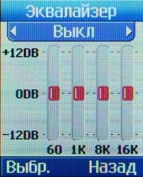 Телефон оснащен эквалайзером, в котором есть несколько пресетов, пользователь может установить любой из них, но не редактировать его. На выбор доступны Классика (усиление низких частот при некотором ослаблении верхнесредних и высоких), Поп (незначительное усиление низких частот), Танец (небольшое ослабление нижнесредних частот и существенное усиление высоких) и Джаз (усиление нижнесреднего и в незначительной мере — верхнесреднего диапазона).