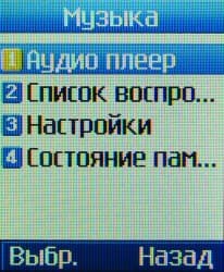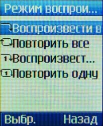 Телефон собирает все имеющиеся в его памяти в соответствующей папке файлы в единый список, сортируя их по именам, и проигрывает в этой последовательности, редактировать плейлист или сохранять несколько его вариантов невозможно. Композиции можно воспроизвести однократно (один раз, от начала до конца списка), либо повторять одну из них или весь список в цикле. Необычна и потенциально полезна возможность повторять в цикле заданный фрагмент песни.