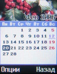 Меню Органайзер открывает доступ к календарю-органайзеру, адресной книге и заметкам. Календарь имеет только ежемесячный способ отображения. Возможности органайзера очень просты, он позволяет только добавлять напоминания без определения их типа, впрочем, напоминания могут повторяться с периодичностью от одного дня до года. Всего их может быть только 20, что явно недостаточно.