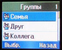 Записи телефонной книги можно разделить по группам — в телефоне есть предустановленные группы Семья, Друзья, Коллеги, VIP, Другие и две пользовательские; все группы можно переименовать. Для каждой группы назначаются индивидуальные мелодии вызова и назначаются пиктограммы, отображаемые при входящем звонке. Отдельным абонентам можно присвоить метки голосового набора — эта функция присутствует в данной модели. Для однозначной идентификации номера, который следует набирать при голосовом вызове абонента, назначается «главный» номер в записи, если их там несколько. Записи из памяти SIM -карты и телефона выводятся в едином списке.