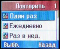 Пункт Установки содержит обычные опции настройки как сетевых функций (запрет звонков, выбор сети и т.д.), так и самого телефона. Здесь же отдельным пунктом числится будильник. Для него можно выставить только один сигнал, срабатывающий на выбор одноразово, ежедневно, еженедельно или ежемесячно. Этих опций вполне достаточно для большинства обычных пользователей, но только одного сигнала явно мало.