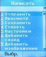 Пункт Сообщения позволяет работать с SMS, EMS и MMS. Аппарат оборудован 115 ячейками памяти для SMS и 600 KB для мультимедийных сообщений. Первая цифра вполне достаточна, вторая, по нынешним временам, мала. Поддерживаются многостраничные сообщения MMS. Апплет, отвечающий за работу с этими сообщениями, имеет интерфейс, несколько отличный, от общего стиля меню.