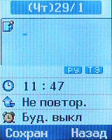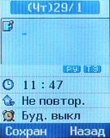 В пункте Установки собраны все настройки телефона, сетевых функций, а также установка будильника, что несколько неожиданно. Для будильника можно выставить только один сигнал, он может быть однократным или повторяющимся ежедневно, еженедельно или ежемесячно.