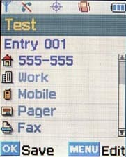 Телефонная книга Matrix Phone рассчитана на хранение 300 записей, в каждую из которых можно занести номера домашнего, мобильного и рабочего телефонов, факса, пейджера, адрес e-mail и WWW, принадлежность к абонентской группе, мелодию вызова, дату рождения, секретную информацию, поле для заметок и картинку. Столь детальную информацию можно хранить только в немногих лучших бизнес-моделях стандарта GSM от Nokia, Siemens и Sony Ericsson. Для CDMA-моделей Samsung она не является чем-то из ряда вон выходящим, но в GSM-аппаратах этой компании до сих пор не встречалась. Список записей вызывается из режима ожидания отклонением джойстика вниз.