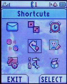 Выделенным по умолчанию является центральный пункт Shortcuts, это настраиваемое меню наиболее употребительных команд. По умолчанию нам был предложен эклектичный список опций начиная от настройки скринсейвера и заканчивая запуском WAP-броузера. Желая подобрать более подходящий перечень команд, мы перешли в меню Settings -> Shortcuts Setup… но не тут-то было. Здесь удалось найти только опцию присвоения голосовых команд пунктам меню Shortcuts — и никаких намеков на редактирование их списка. Недостаток можно списать на особенности ранней версии прошивки, к тому же, ориентированной на дальневосточный регион (судя по набору языков), можно надеяться, что в российской прошивке эти недостатки будут исправлены.