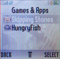 Меню Games&Apps содержит Java-приложения. По умолчанию в нашем образце были предустановленны: логическая игра Skipping Stones и простая аркадная игра Hungry Fish. Еще раз отметим, что Java -машина в телефонах Motorola из «триплета» имеет возможность автоматической приостановки выполнения мидлета при «быстром» выходе из него с использованием клавиши отбоя — в таком случае выводится меню, из которого можно выбрать приостановку (Suspend) или завершение приложения. Мидлет находится в «спящем» состоянии все последующее время (если телефон не выключается, тогда происходит сброс, но состояние программы все же фиксируется во флэш-памяти) пока его опять не вызовут через меню. После этого он запустится практически моментально и в том состоянии, в котором был приостановлен.