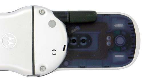 Для v70 выпускается и более емкая батарея (700 мА·ч), но ее придется докупать отдельно, к тому же этот аккумулятор, имеющий другую заднюю крышку, увеличивает толщину телефона. Являющаяся частью корпуса задняя крышка, как и в модели v60, выполнена из анодированного алюминия. Сняв крышку, мы увидим аккумулятор и расположенный над ним держатель SIM-карты — не совсем типичное для Motorola решение, продиктованное стремлением миниатюризировать телефон.