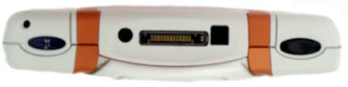 На правом торце есть небольшая черная кнопочка включения/выключения телефона и смены профилей. А на верхнем торце можно найти полупрозрачную клавишу-качельку регулировки громкости динамика, хотя в первый момент кажется, что это не кнопка, а ИК-порт :-). В центре находится интерфейсный разъем для подключения гарнитуры, USB-провода и аудиокабеля. Тут же находится кнопка быстрого вызова аудио-приложений (MP3-плеера и FM-радио).