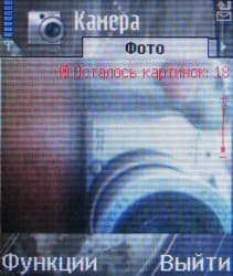 При работающем приложении Камера на экран выводится окно видоискателя. Вертикальным отклонением джойстика можно управлять цифровым увеличением картинки, горизонтальным — переключаться между режимами фото- и видеосъемки. Быстрой регулировки экспозиции нет, эта опция доступна только через меню. По умолчанию фотографии записываются на карту памяти, если ее нет, программа автоматически переключается на память телефона.