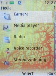 Camera — управление функциями фото- и видеосъемки. При выборе этого пункта включается встроенная камера и на экран выводится окно видоискателя. То же происходит при нажатии клавиши Фото на правой грани корпуса. По умолчанию аппарат находится в режиме фотосъемки, переключение в видеорежим, а также выбор опций осуществляется из меню Options или длинным нажатием на клавишу Фото. В фоторежиме можно включить ночной режим съемки (с увеличенной выдержкой), включить светодиодную «вспышку», задействовать таймерную съемку с единственным значением интервала в 10 с, выполнить серийную съемку (2 кадра в серии), перейти в галерею или выполнить дополнительные настройки. Среди дополнительных опций числятся: качество JPEG-сжатия (3 градации), разрешение кадра (1280×960, 800×600, 640×480, 320×240, 160×120 точек), качество записи видео (3 градации), длина видеоролика (стандартная или максимальная), звуковое сопровождение съемки (можно отключить), шаблон имени файла, место сохранения отснятого материала. Как видим, список опций включает все необходимое для управления качеством съемки, но не содержит никаких излишеств, вроде художественных фильтров. В общем, набор настроек сугубо прагматичный, камера в телефоне рассчитана только на получение снимков, никаких дополнительных функций у нее нет.